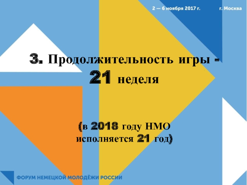 Слайд 8 3. Продолжительность игры - 21 неделя (в 2018 году НМО исполняется 21 год)