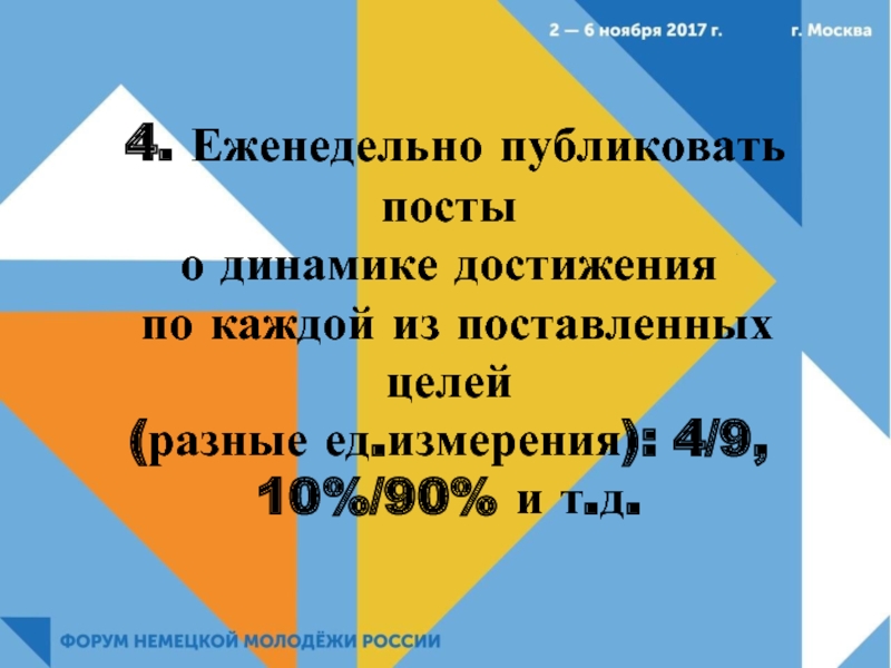 Слайд 10 4. Еженедельно публиковать посты о динамике достижения по каждой из