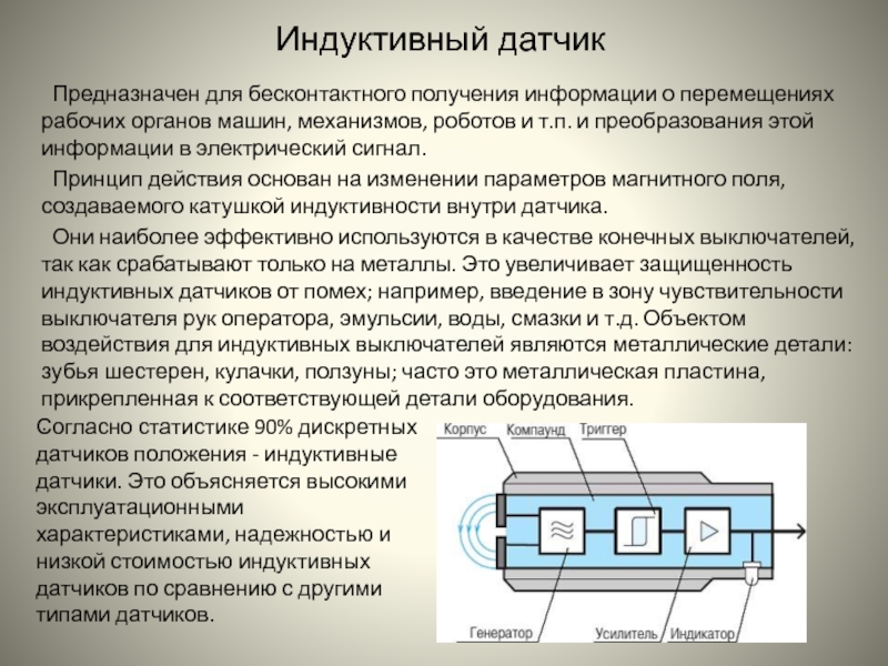 Согласно статистике 90% дискретных датчиков положения - индуктивные датчики. Это объясняется высокими эксплуатационными характеристиками, надежностью и низкой стоимостью индуктивных датчиков по сравнению с другими типами датчиков.