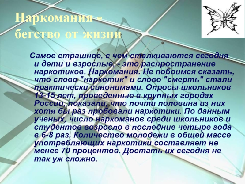 и дети и взрослые, - это распространение наркотиков. Наркомания. Не побоимся сказать, что слово "наркотик" и слово "смерть" стали практически синонимами. Опросы школьников 13-15 лет, проведенные в крупных городах России, показали, что почти половина из них хотя бы раз пробовали наркотики. По данным ученых, число наркоманов среди школьников и студентов возросло в последние четыре года в 6-8 раз. Количество молодежи в общей массе употребляющих наркотики составляет не менее 70 процентов. Достать их сегодня не так уж сложно.