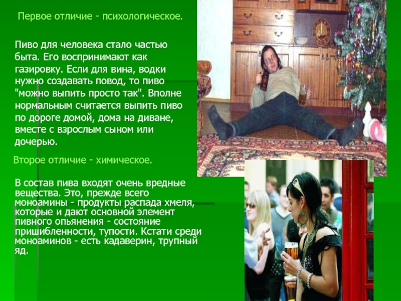 В состав пива входят очень вредные вещества. Это, прежде всего моноамины - продукты распада хмеля, которые и дают основной элемент пивного опьянения - состояние пришибленности, тупости. Кстати среди моноаминов - есть кадаверин, трупный яд.