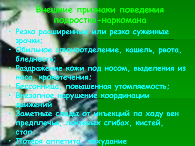 Слайд 17Внешние признаки поведения подростка-наркомана