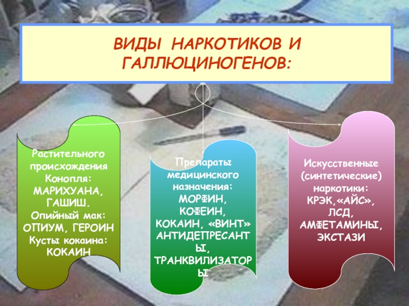 Слайд 13ВИДЫ НАРКОТИКОВ И ГАЛЛЮЦИНОГЕНОВ: