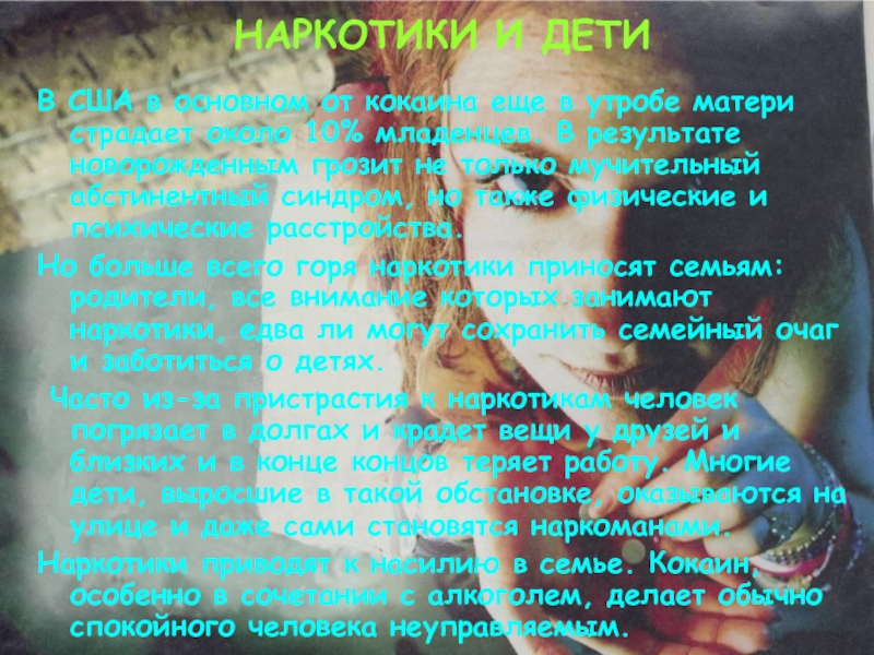 Но больше всего горя наркотики приносят семьям: родители, все внимание которых занимают наркотики, едва ли могут сохранить семейный очаг и заботиться о детях.