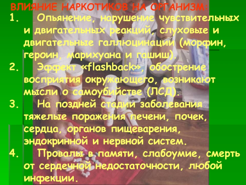 Слайд 14ВЛИЯНИЕ НАРКОТИКОВ НА ОРГАНИЗМ: