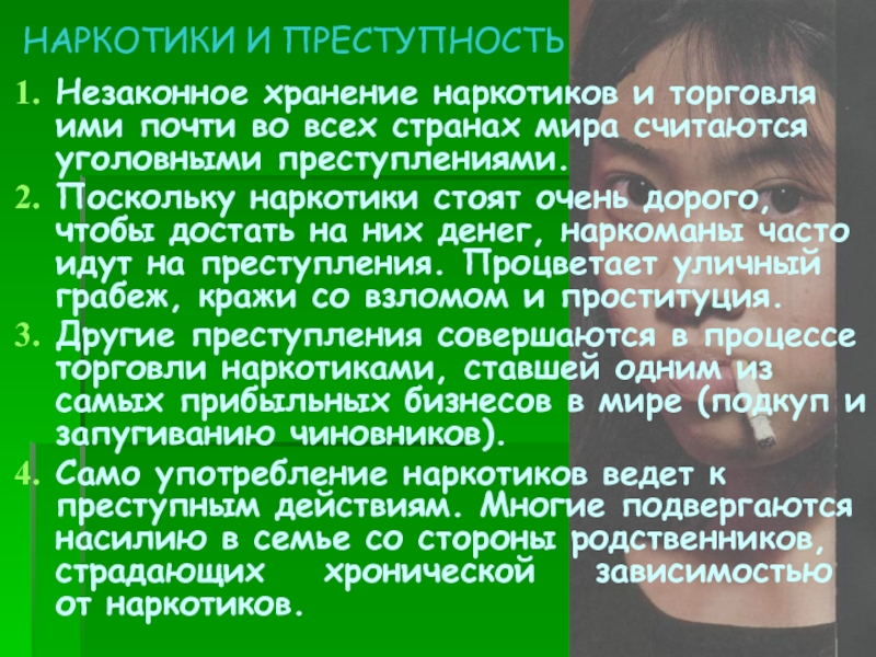 Само употребление наркотиков ведет к преступным действиям. Многие подвергаются насилию в семье со стороны родственников, страдающих хронической зависимостью от наркотиков.