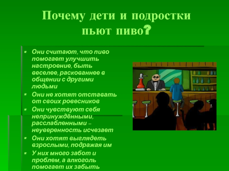 как газировку. Если для вина, водки нужно создавать повод, то пиво "можно выпить просто так". Вполне нормальным считается выпить пиво по дороге домой, дома на диване, вместе с взрослым сыном или дочерью.