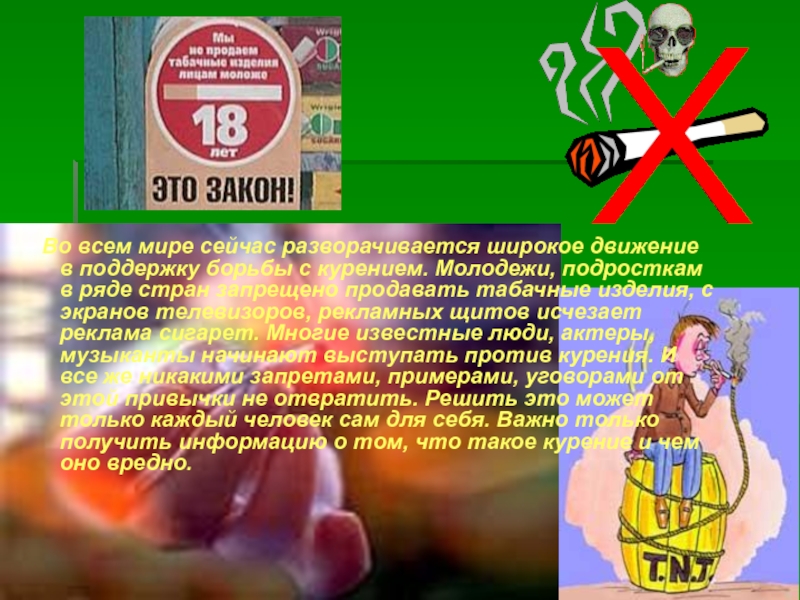 с курением. Молодежи, подросткам в ряде стран запрещено продавать табачные изделия, с экранов телевизоров, рекламных щитов исчезает реклама сигарет. Многие известные люди, актеры, музыканты начинают выступать против курения. И все же никакими запретами, примерами, уговорами от этой привычки не отвратить. Решить это может только каждый человек сам для себя. Важно только получить информацию о том, что такое курение и чем оно вредно.