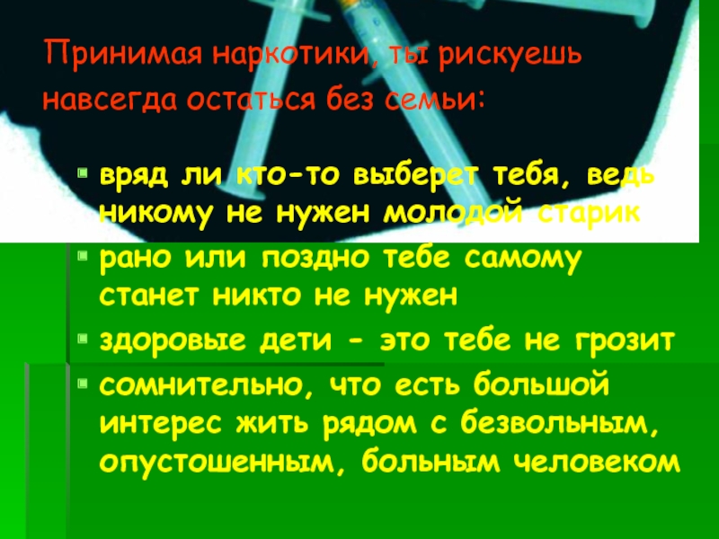 Слайд 18Принимая наркотики, ты рискуешь навсегда остаться без семьи: