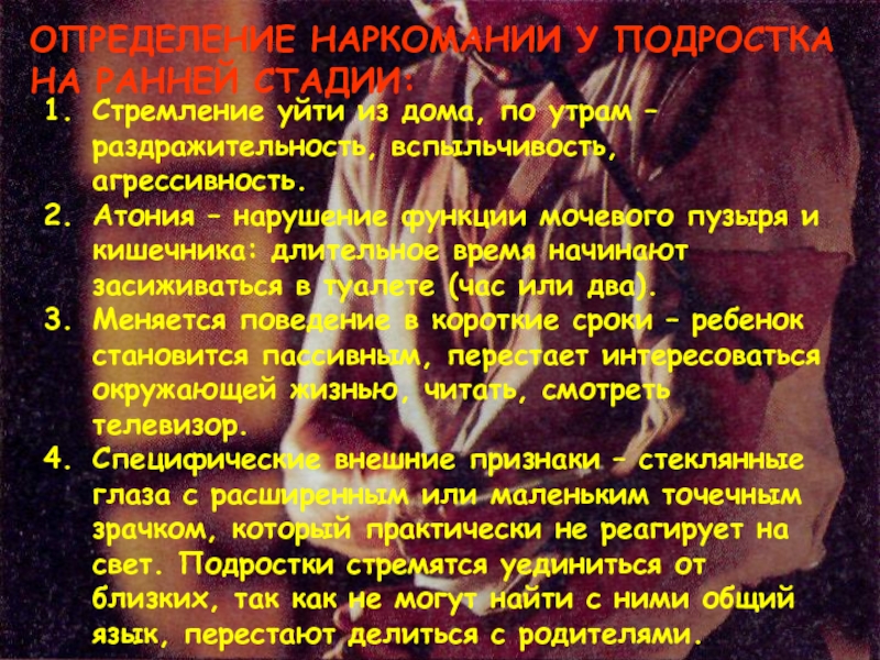 Слайд 16ОПРЕДЕЛЕНИЕ НАРКОМАНИИ У ПОДРОСТКА НА РАННЕЙ СТАДИИ: