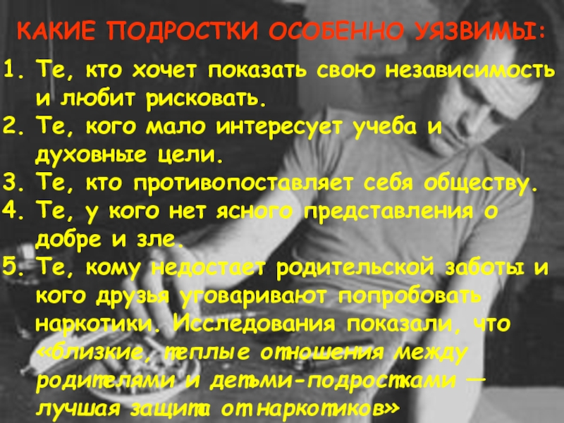 Те, кому недостает родительской заботы и кого друзья уговаривают попробовать наркотики. Исследования показали, что «близкие, теплые отношения между родителями и детьми-подростками — лучшая защита от наркотиков»