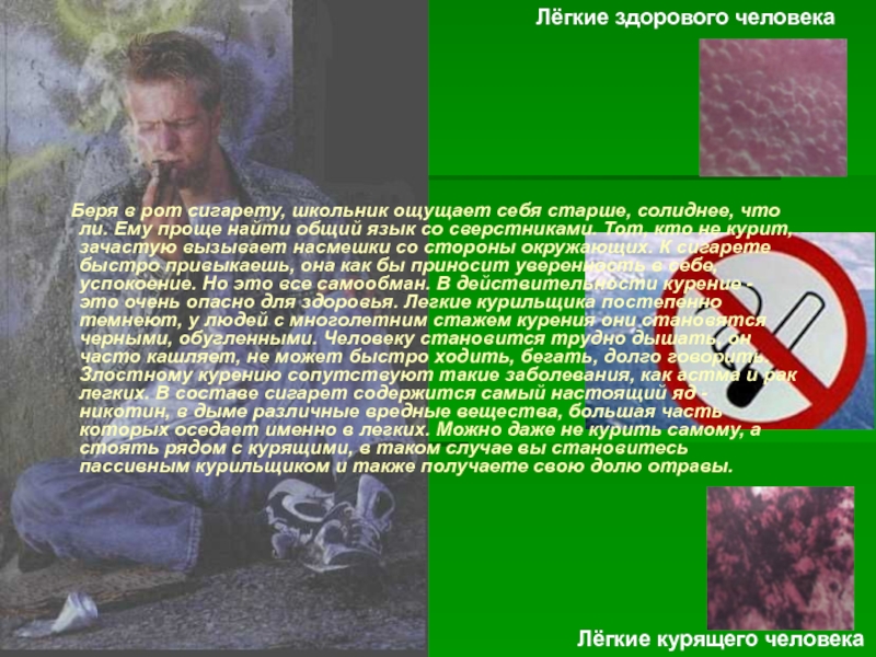 солиднее, что ли. Ему проще найти общий язык со сверстниками. Тот, кто не курит, зачастую вызывает насмешки со стороны окружающих. К сигарете быстро привыкаешь, она как бы приносит уверенность в себе, успокоение. Но это все самообман. В действительности курение - это очень опасно для здоровья. Легкие курильщика постепенно темнеют, у людей с многолетним стажем курения они становятся черными, обугленными. Человеку становится трудно дышать, он часто кашляет, не может быстро ходить, бегать, долго говорить. Злостному курению сопутствуют такие заболевания, как астма и рак легких. В составе сигарет содержится самый настоящий яд - никотин, в дыме различные вредные вещества, большая часть которых оседает именно в легких. Можно даже не курить самому, а стоять рядом с курящими, в таком случае вы становитесь пассивным курильщиком и также получаете свою долю отравы.
