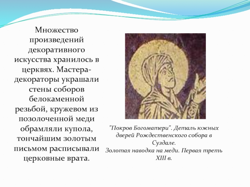 "Покров Богоматери". Деталь южных дверей Рождественского собора в Суздале.