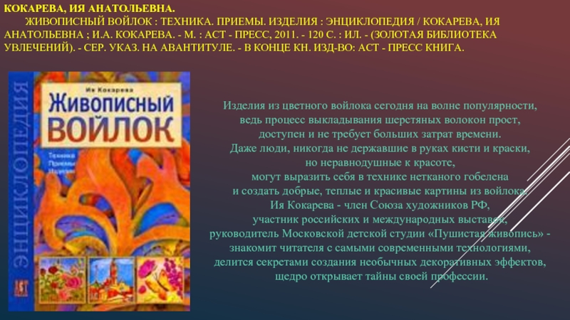 ЖИВОПИСНЫЙ ВОЙЛОК : ТЕХНИКА. ПРИЕМЫ. ИЗДЕЛИЯ : ЭНЦИКЛОПЕДИЯ / КОКАРЕВА, ИЯ АНАТОЛЬЕВНА ; И.А. КОКАРЕВА. - М. : АСТ - ПРЕСС, 2011. - 120 С. : ИЛ. - (ЗОЛОТАЯ БИБЛИОТЕКА УВЛЕЧЕНИЙ). - СЕР. УКАЗ. НА АВАНТИТУЛЕ. - В КОНЦЕ КН. ИЗД-ВО: АСТ - ПРЕСС КНИГА.