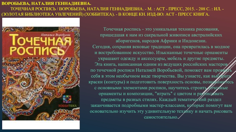 по точечной росписи Наталией Воробьевой, поможет вам проявить себя в этом необычном виде творчества. Вы узнаете, как выбирать краски (контуры) и подготовить поверхность основы, познакомитесь с основными элементами росписи, научитесь строить точечные орнаменты и композиции, "играть" с цветом и расписывать предметы в разных стилях. Каждый тематический раздел заканчивается подробными мастер-классами, которые помогут вам основательно изучить эту удивительную технику и начать рисовать самостоятельно.