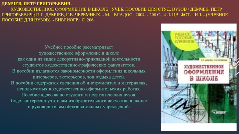т.е. комплексного архитектурно-дизайнерского формирования окружающей человека предметно-пространственной среды. Рассчитано на учащихся художественных школ, средних учебных заведений архитектурного и дизайнерского профиля.
