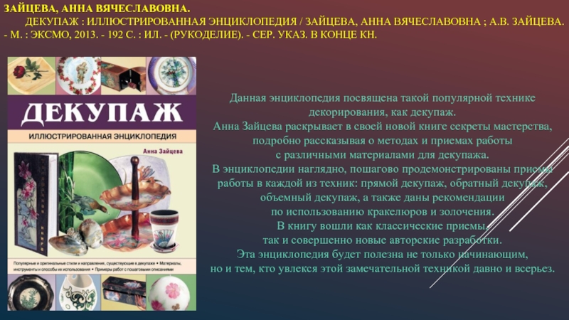Данная энциклопедия посвящена такой популярной технике декорирования, как декупаж.
