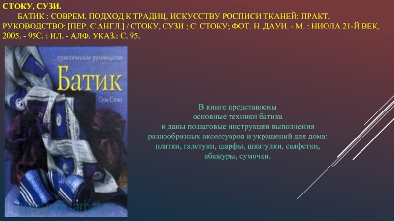 и даны пошаговые инструкции выполнения разнообразных аксессуаров и украшений для дома: платки, галстуки, шарфы, шкатулки, салфетки, абажуры, сумочки.