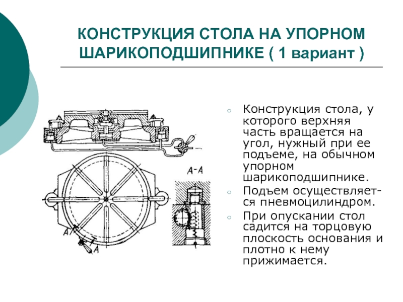 При пуске сжатого воздуха в канал 20 происходит опускание поршня 18 и вывод фиксатора 15 из паза делительного диска 14. Далее происходит подъем поршня 17 со штоком 21 с зубьями, входящими в зацепление с храповым колесом 12. Выдвижной упор 11 ограничивает ход поршня углом деления поворотной части, сидящей на валу 3. После отсечки и выпуска сжатого воздуха поршни 18 и 17 под действием пружин 19 и 16 занимают исходное положение, а фиксатор входит в очередной паз делительного диска. Шарнирно закрепленный шток при движении вниз отклоняется влево, отжимая подпружиненный палец 22.