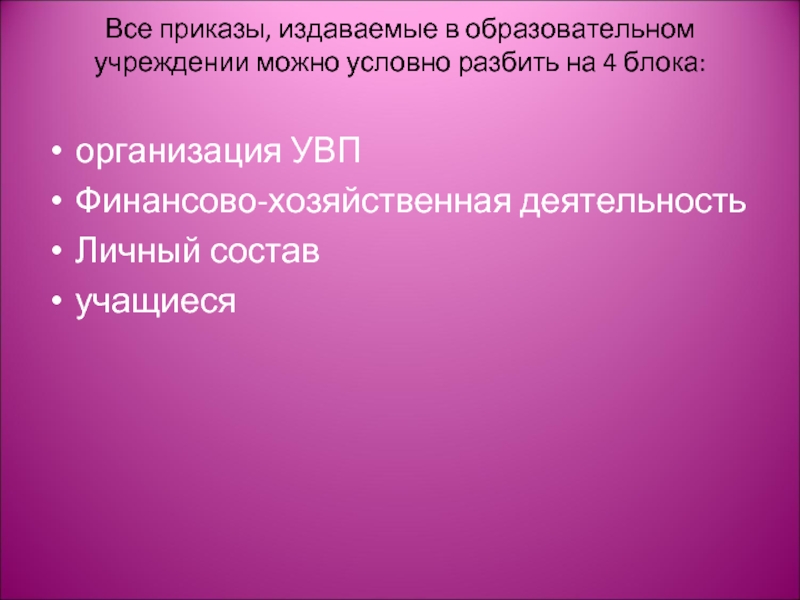Слайд 4Все приказы, издаваемые в образовательном учреждении можно условно разбить на 4