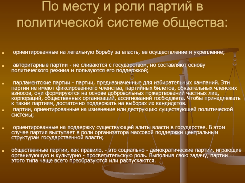 Слайд 27По месту и роли партий в политической системе общества: