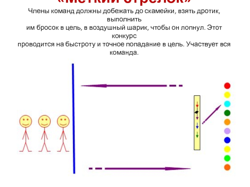 Члены команд должны добежать до скамейки, взять дротик, выполнить