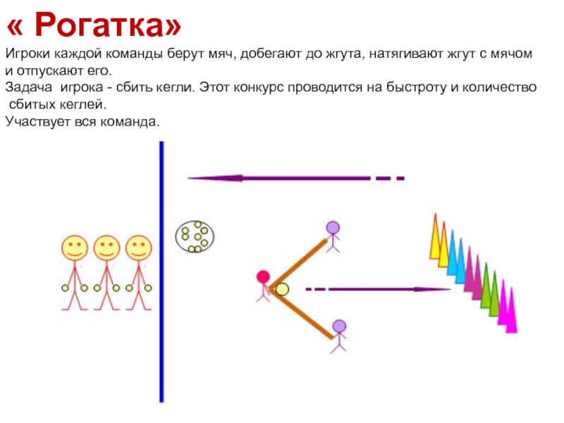 Игроки каждой команды берут мяч, добегают до жгута, натягивают