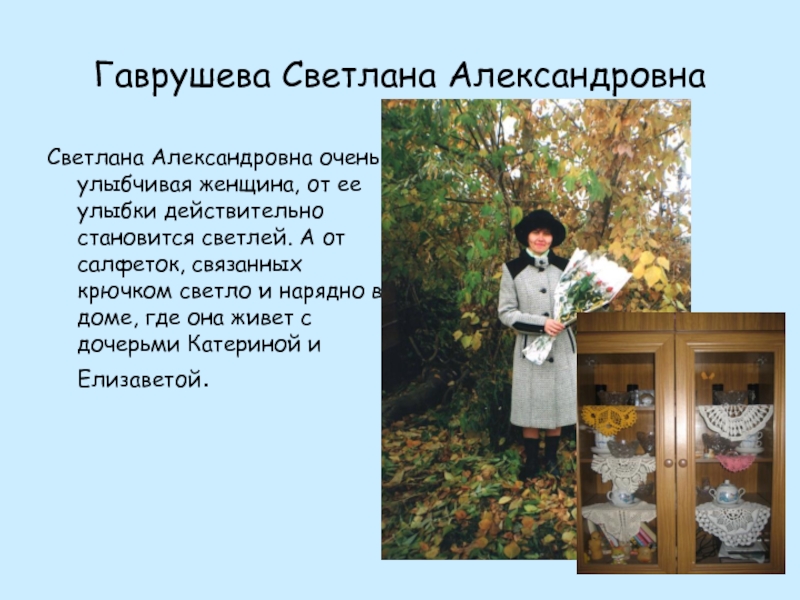 становится светлей. А от салфеток, связанных крючком светло и нарядно в доме, где она живет с дочерьми Катериной и Елизаветой.