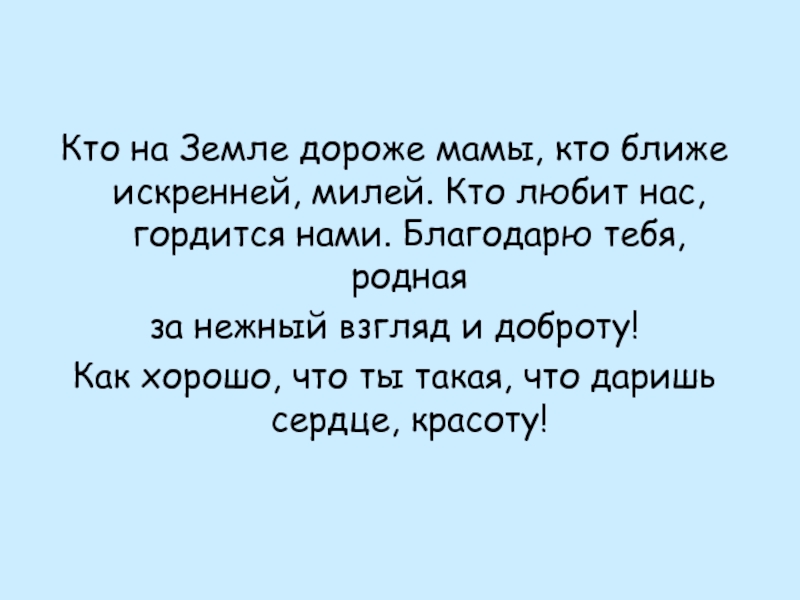 Кто на Земле дороже мамы, кто ближе искренней, милей. Кто любит