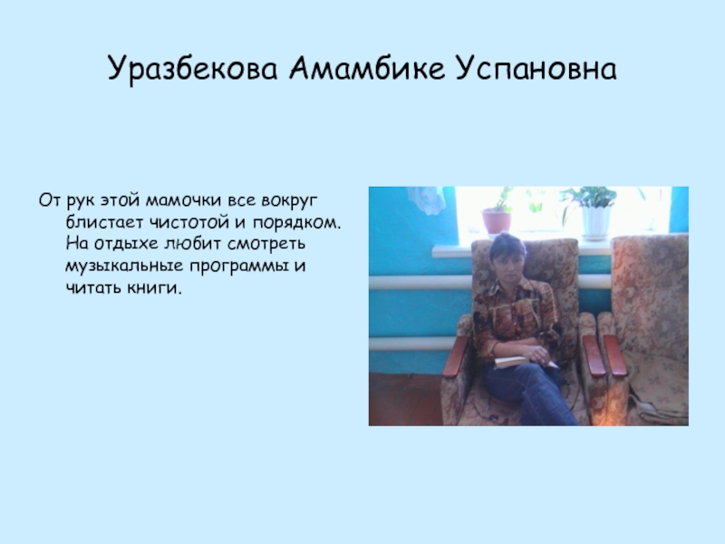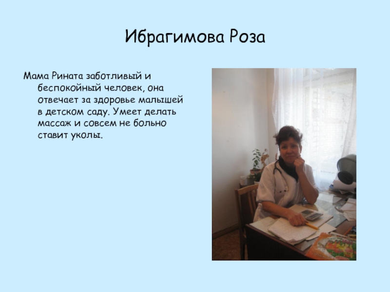 Мама Рината заботливый и беспокойный человек, она отвечает за здоровье