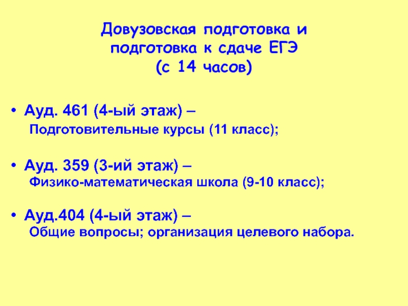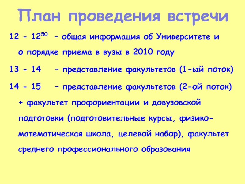 14 - 15 – представление факультетов (2-ой поток) + факультет профориентации и довузовской подготовки (подготовительные курсы, физико-математическая школа, целевой набор), факультет среднего профессионального образования