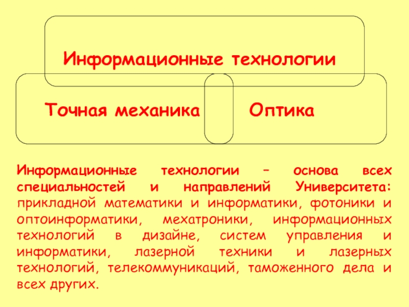 прикладной математики и информатики, фотоники и оптоинформатики, мехатроники, информационных технологий в дизайне, систем управления и информатики, лазерной техники и лазерных технологий, телекоммуникаций, таможенного дела и всех других.
