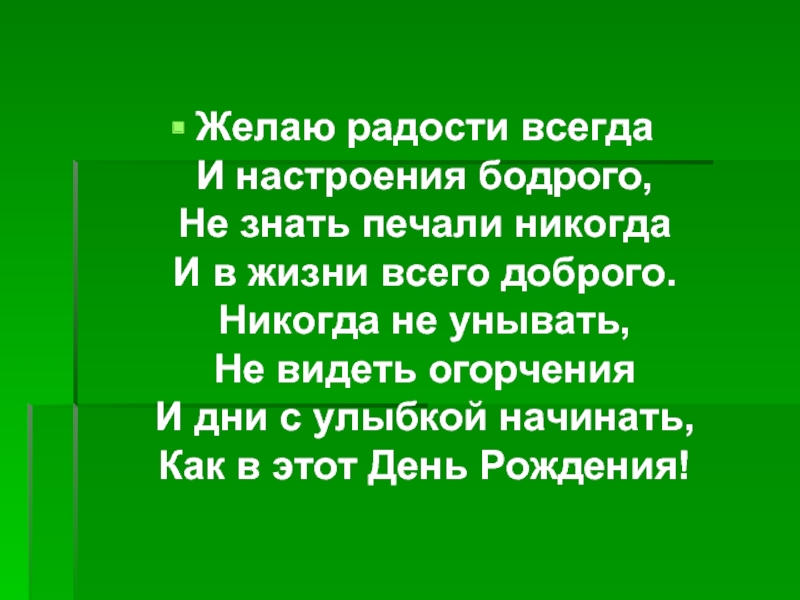 доброго. Никогда не унывать, Не видеть огорчения И дни с улыбкой начинать, Как в этот День Рождения!