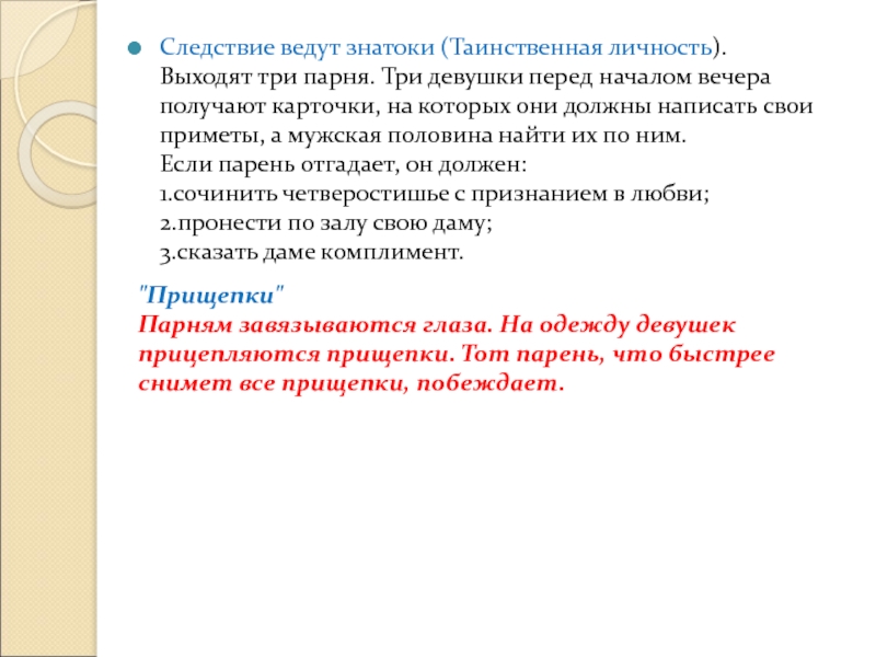 Парням завязываются глаза. На одежду девушек прицепляются прищепки. Тот парень, что быстрее снимет все прищепки, побеждает.