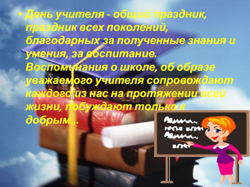 Слайд 7День учителя - общий праздник, праздник всех поколений, благодарных за полученные