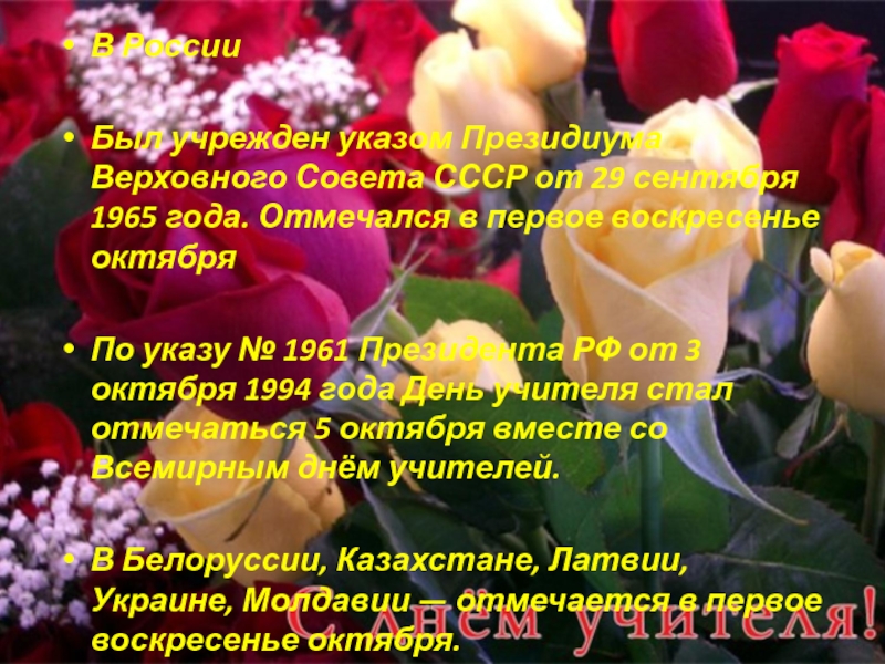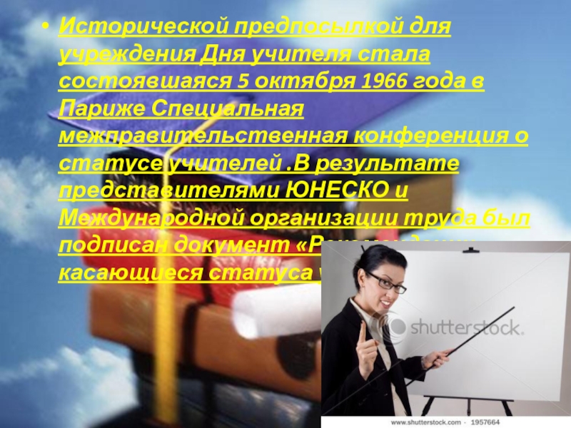 Слайд 4Исторической предпосылкой для учреждения Дня учителя стала состоявшаяся 5 октября 1966