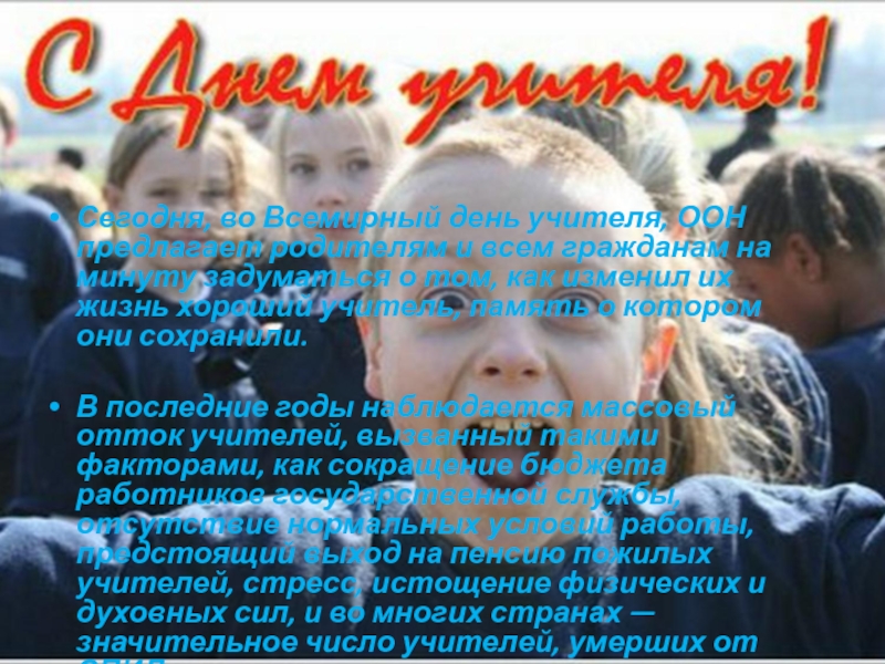 Слайд 5Сегодня, во Всемирный день учителя, ООН предлагает родителям и всем гражданам