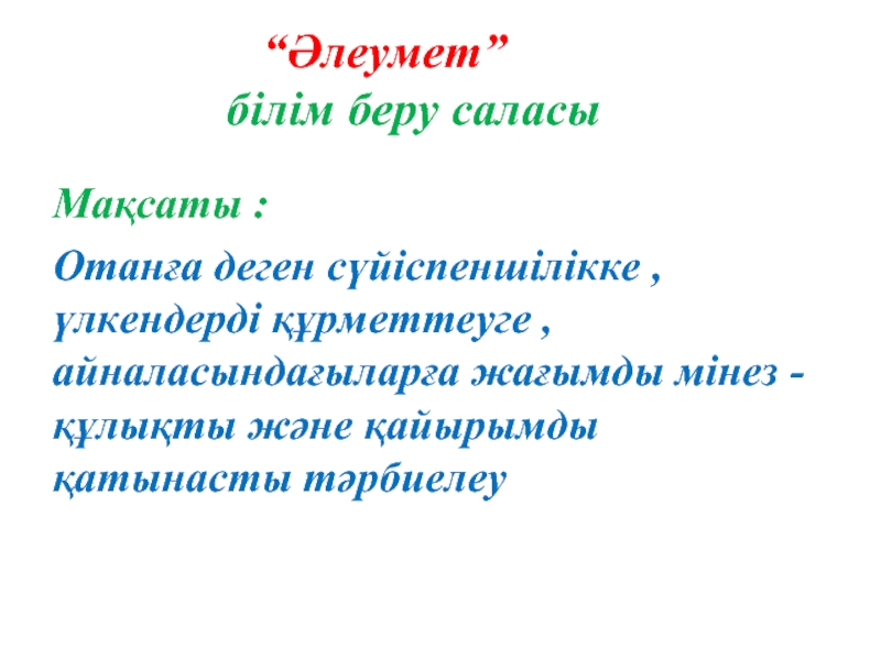Отанға деген сүйіспеншілікке , үлкендерді құрметтеуге , айналасындағыларға жағымды мінез -құлықты және қайырымды қатынасты тәрбиелеу