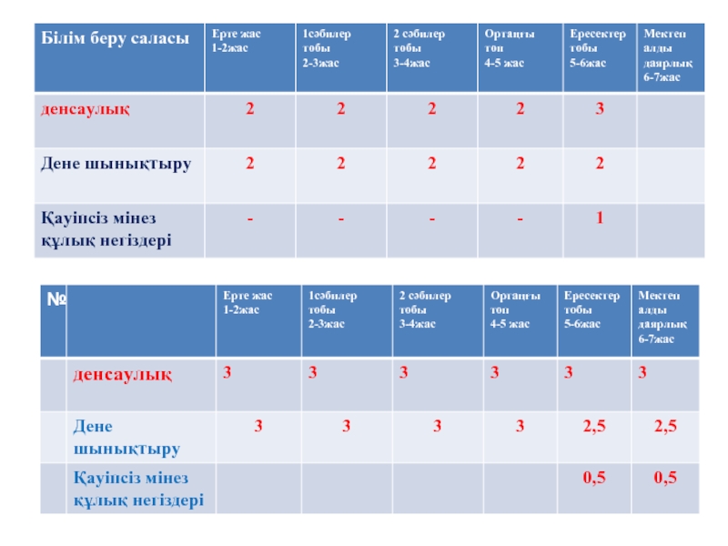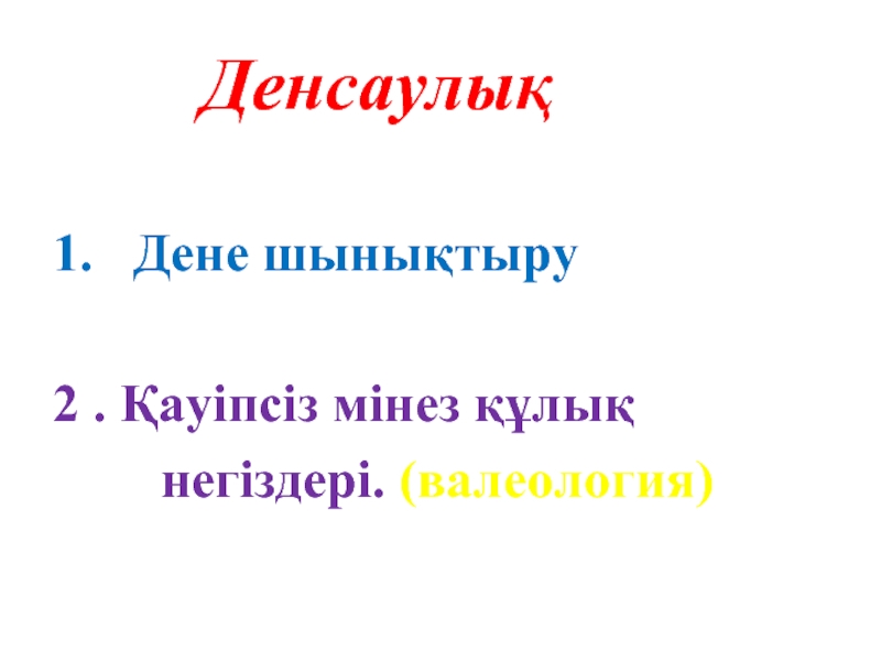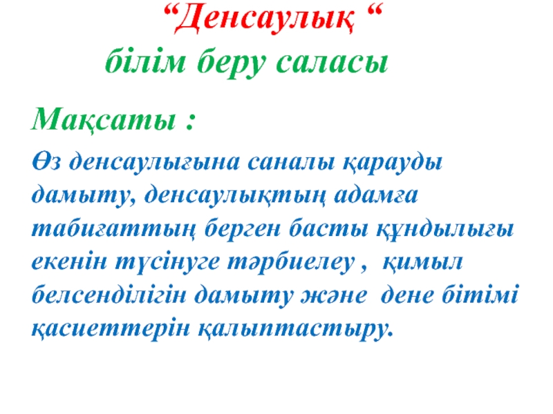 Өз денсаулығына саналы қарауды дамыту, денсаулықтың адамға табиғаттың берген басты құндылығы екенін түсінуге тәрбиелеу , қимыл белсенділігін дамыту және дене бітімі қасиеттерін қалыптастыру.