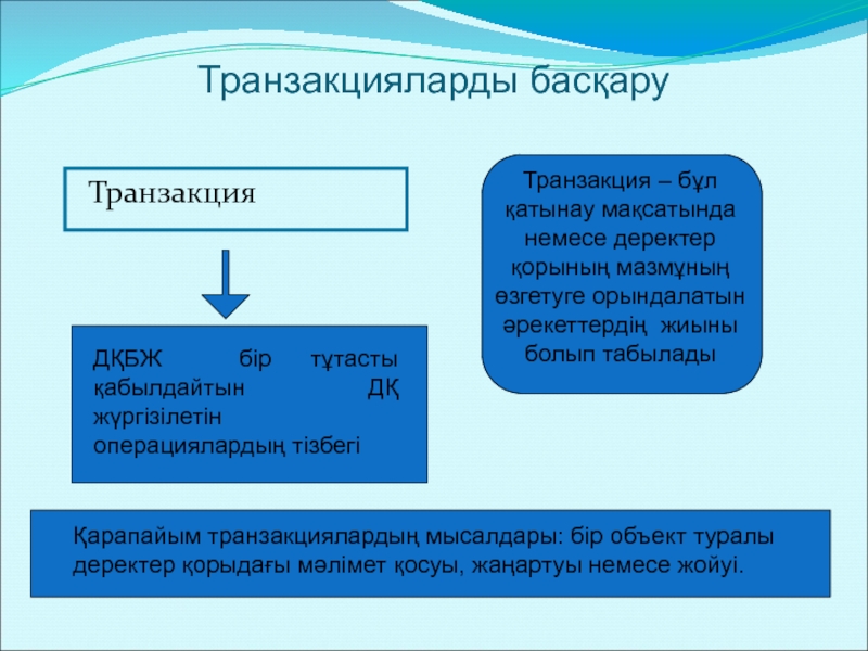 Қарапайым транзакциялардың мысалдары: бір объект туралы деректер қорыдағы мәлімет қосуы, жаңартуы немесе жойуі.