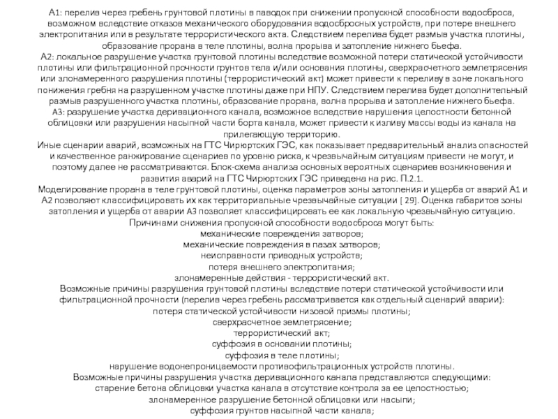 А2: локальное разрушение участка грунтовой плотины вследствие возможной потери статической устойчивости плотины или фильтрационной прочности грунтов тела и/или основания плотины, сверхрасчетного землетрясения или злонамеренного разрушения плотины (террористический акт) может привести к переливу в зоне локального понижения гребня на разрушенном участке плотины даже при НПУ. Следствием перелива будет дополнительный размыв разрушенного участка плотины, образование прорана, волна прорыва и затопление нижнего бьефа.