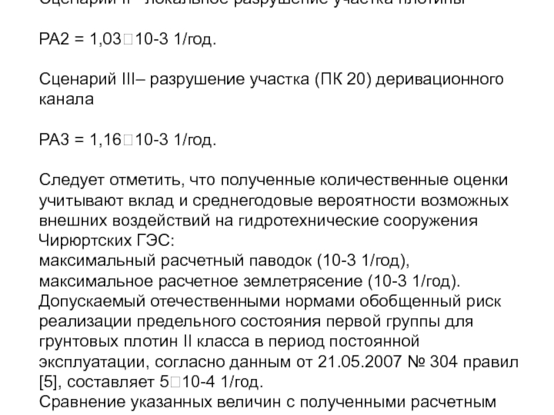 Следует отметить, что полученные количественные оценки учитывают вклад и среднегодовые вероятности возможных внешних воздействий на гидротехнические сооружения Чирюртских ГЭС: