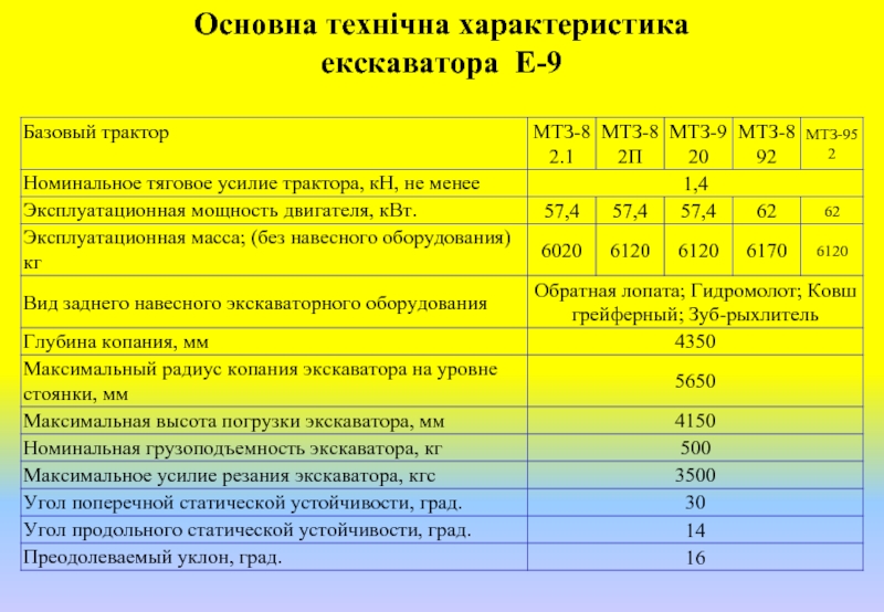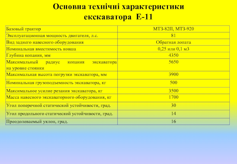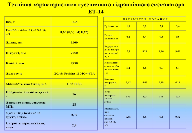 Слайд 56Технічна характеристики гусеничного гідравлічного екскаватора ЕТ-14