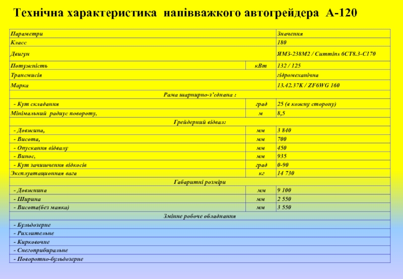 Слайд 9Технічна характеристика напівважкого автогрейдера А-120