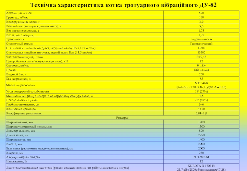 Слайд 32Технічна характеристика котка тротуарного вібраційного ДУ-82