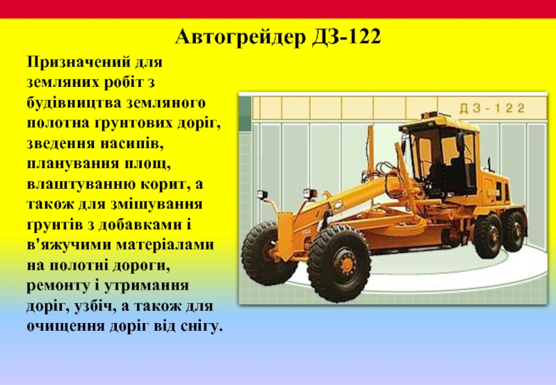 зведення насипів, планування площ, влаштуванню корит, а також для змішування ґрунтів з добавками і в'яжучими матеріалами на полотні дороги, ремонту і утримання доріг, узбіч, а також для очищення доріг від снігу.