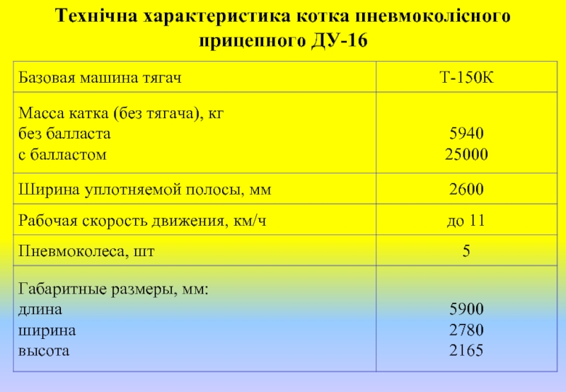 Слайд 28Технічна характеристика котка пневмоколісного  прицепного ДУ-16