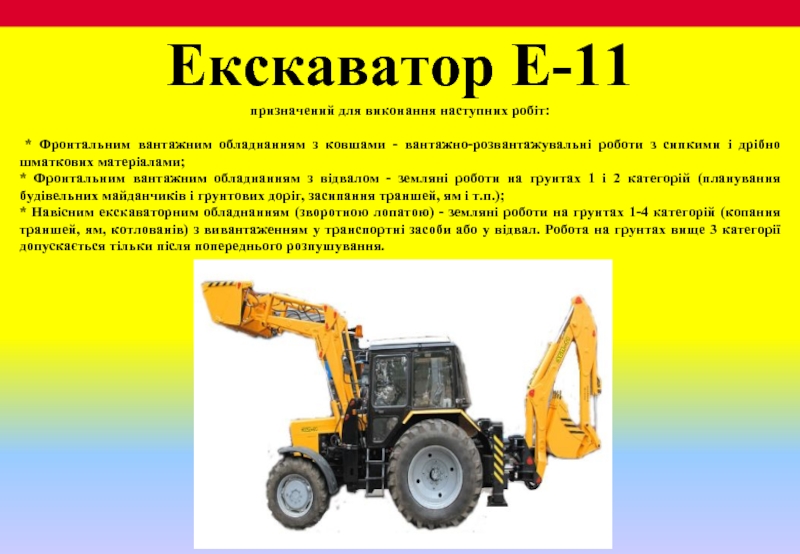 * Навісним екскаваторним обладнанням (зворотною лопатою) - земляні роботи на грунтах 1-4 категорій (копання траншей, ям, котлованів) з вивантаженням у транспортні засоби або у відвал. Робота на грунтах вище 3 категорії допускається тільки після попереднього розпушування.
