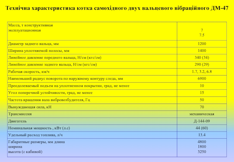 Слайд 20Технічна характеристика котка самохідного двух вальцевого вібраційного ДМ-47