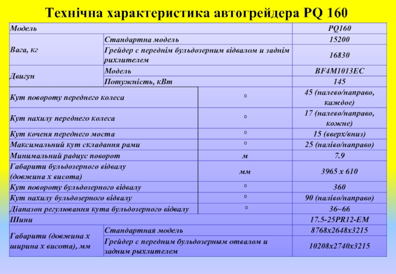 Слайд 7Технічна характеристика автогрейдера PQ 160